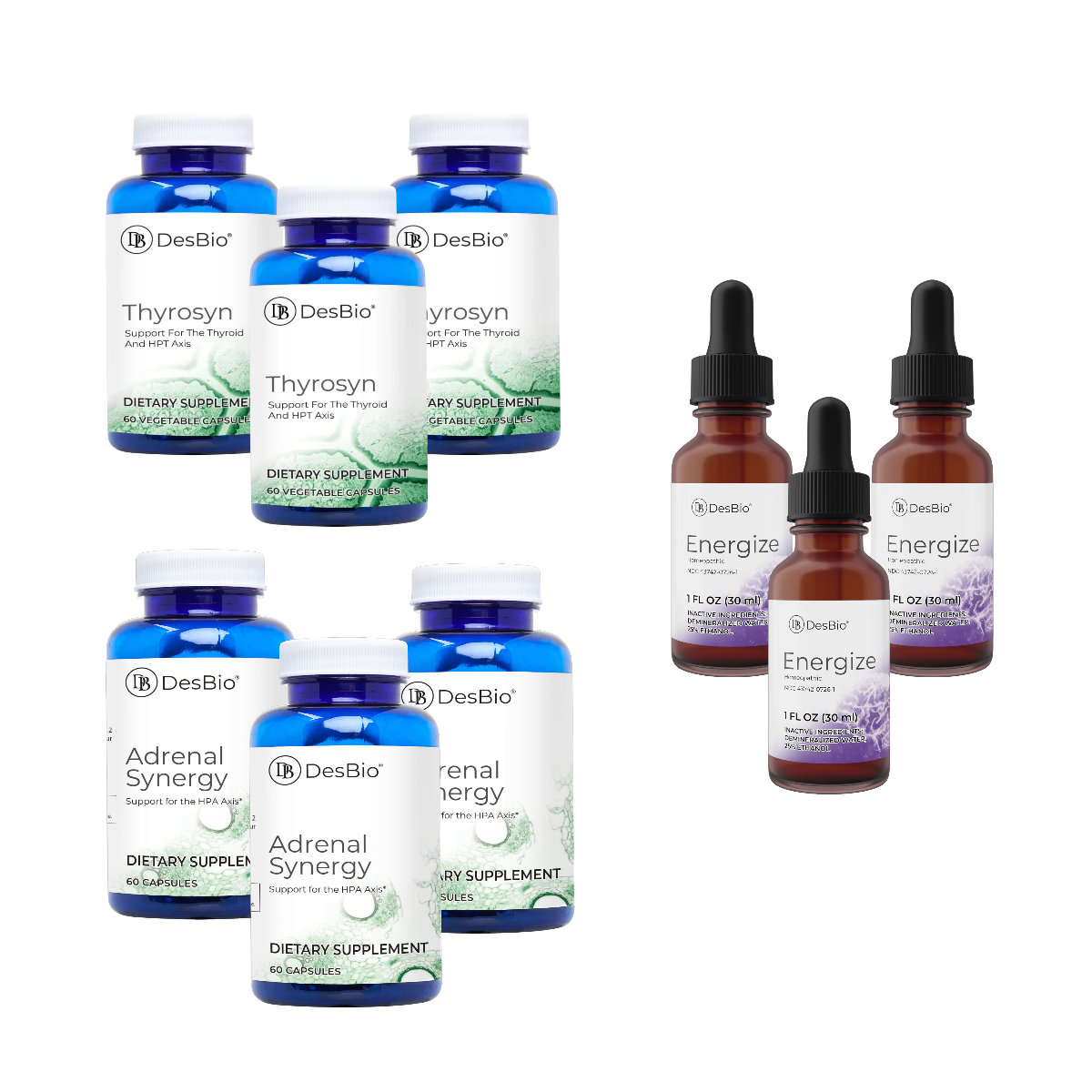 How they work together: This bundle is designed to support the body's natural stress response, energy production, and thyroid health. ThyroSyn supports thyroid and HPT axis function, Adrenal Synergy supports adrenal and HPA axis function, and Energize 1oz dropper provides homeopathic support for the temporary relief of symptoms including thyroid support and lack of energy.