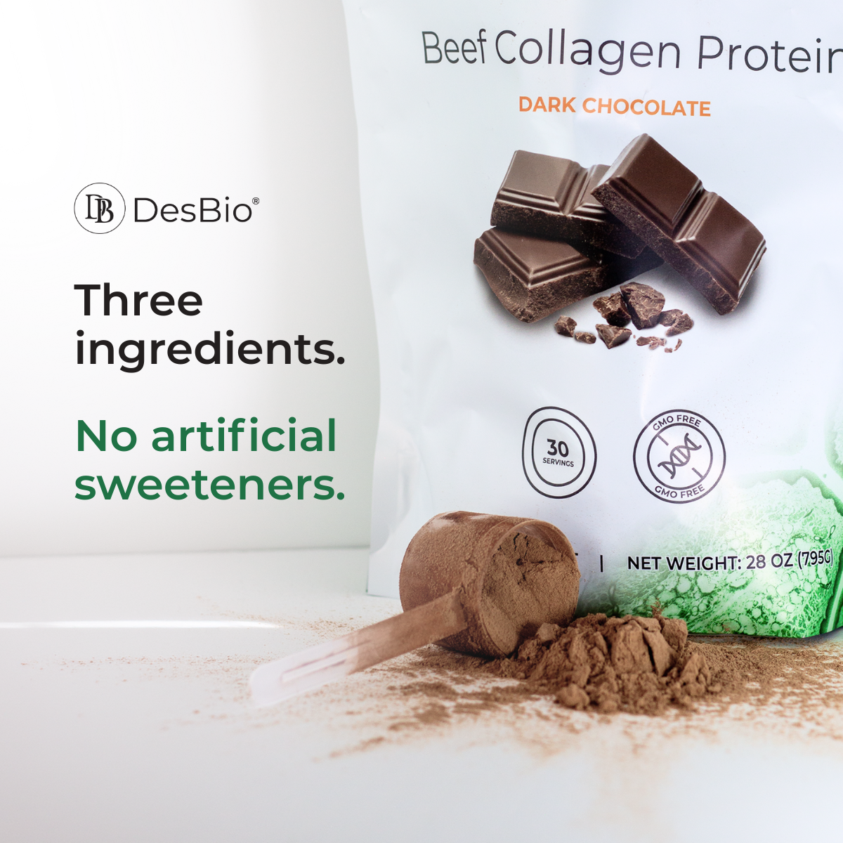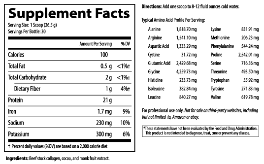 Three ingredients only—beef stock collagen, cocoa, monk fruit extract