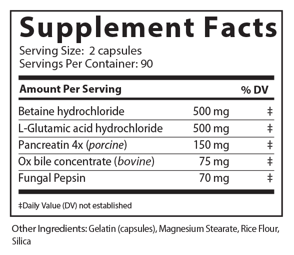 Gastrozyne is a digestive support product designed with powerful enzymes and hydrochloric acid to aid in the breakdown of proteins, carbohydrates, and fats. Gastrozyne supports healthy digestive processes and immune system function in both the stomach and small intestine.