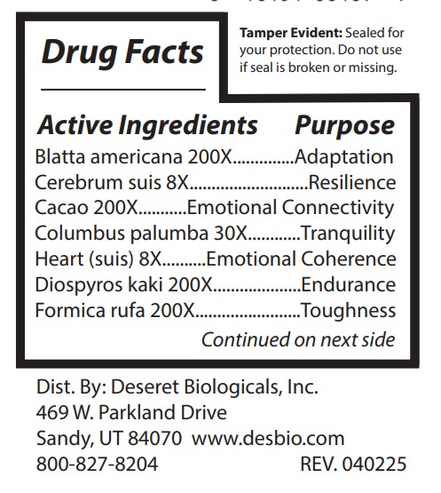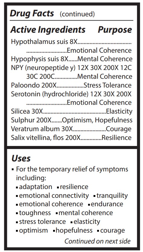 Homeopathic Indications: For the temporary relief of symptoms including: adaptation, resilience, emotional connectivity, tranquility, emotional coherence, endurance, toughness, mental coherence, stress tolerance, elasticity, optimism, hopefulness, courage.